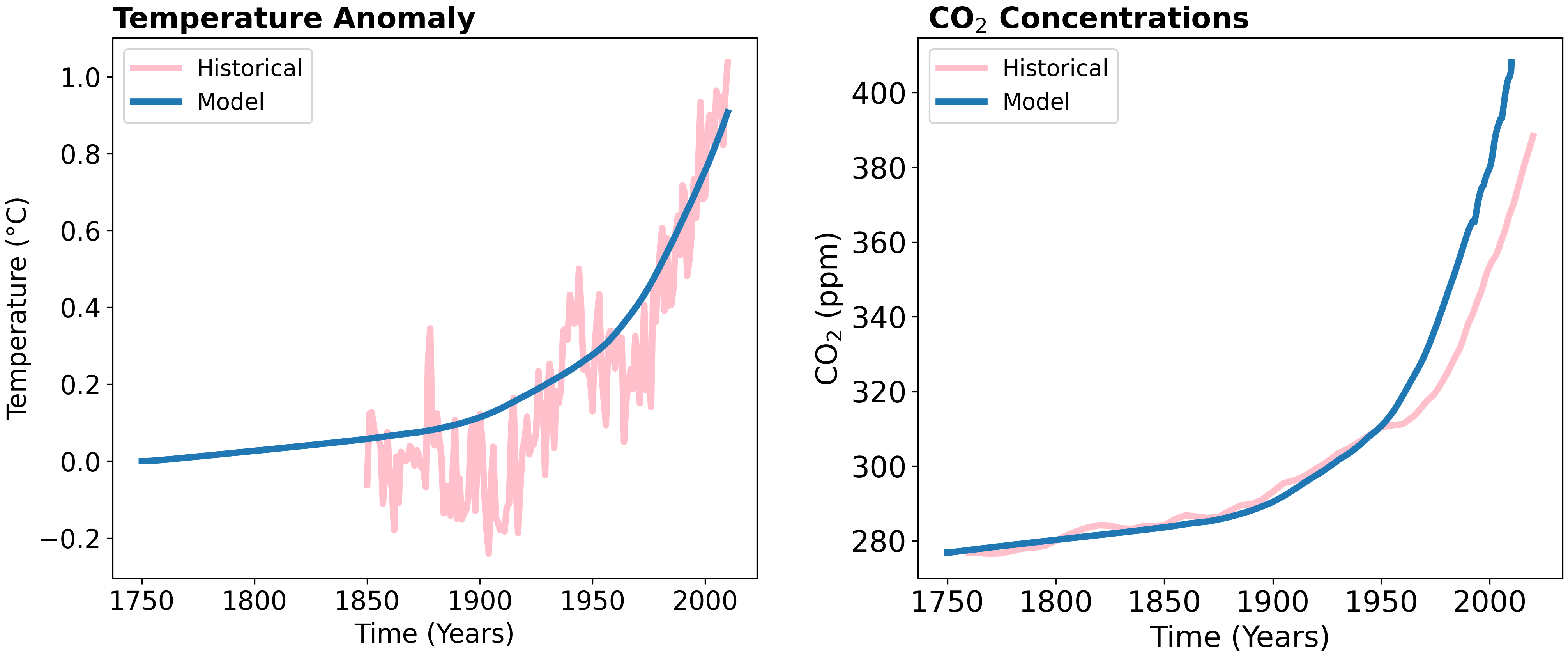 On the image right, our model predicts slightly higher CO2 concentrations because as atmospheric carbon increases, plants actually uptake more carbon. We used a fixed coefficient for this, but realistically it is variable (to a point) and has increased. However, the model is sufficient to describe the relationships we are interested in qualitatively.